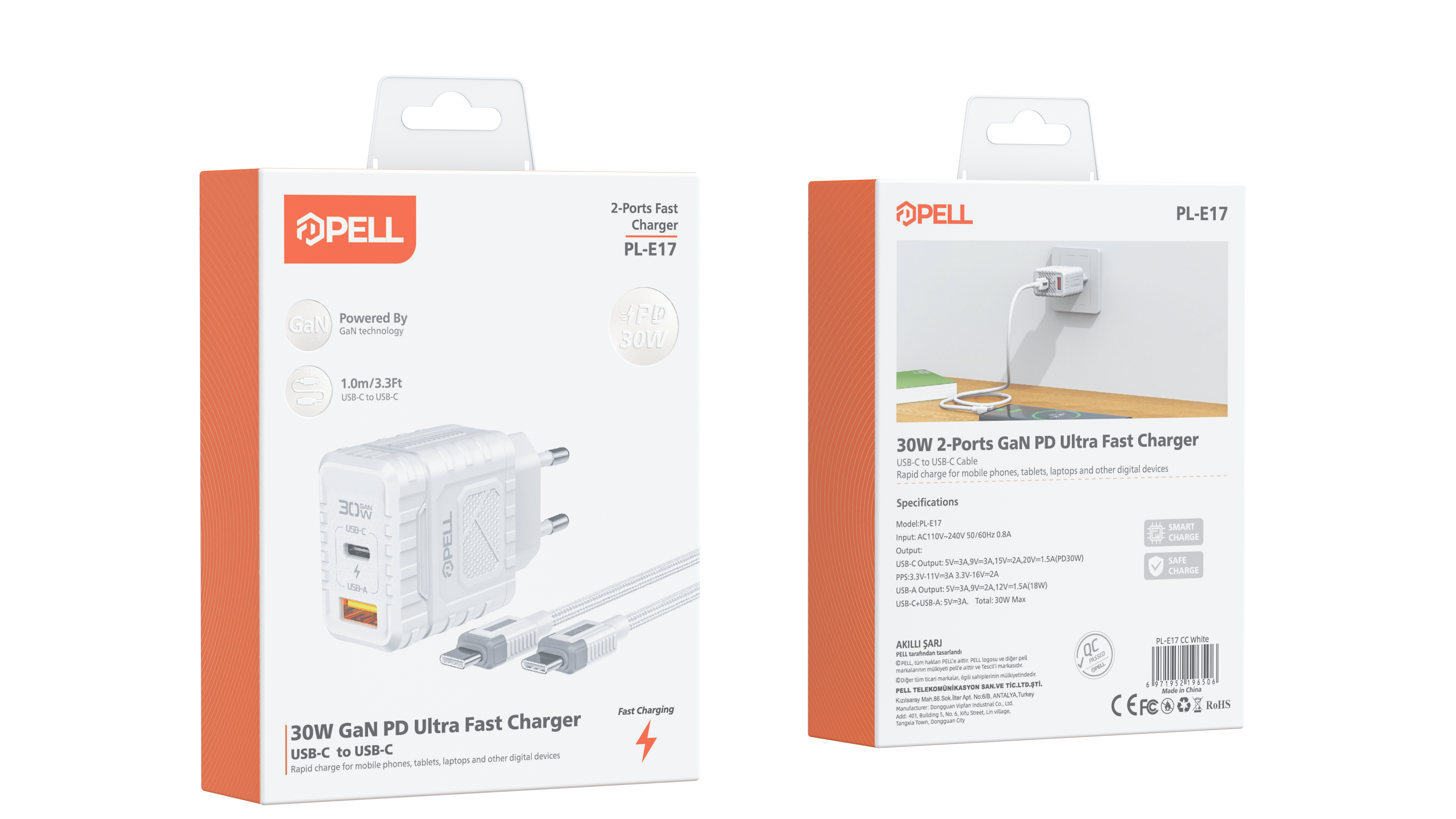 Pell PL-E17 30w Gan PD Ultra Hızlı Şarj Cihazı Çift Port-TYPE-C TO TYPE-C KABLO
